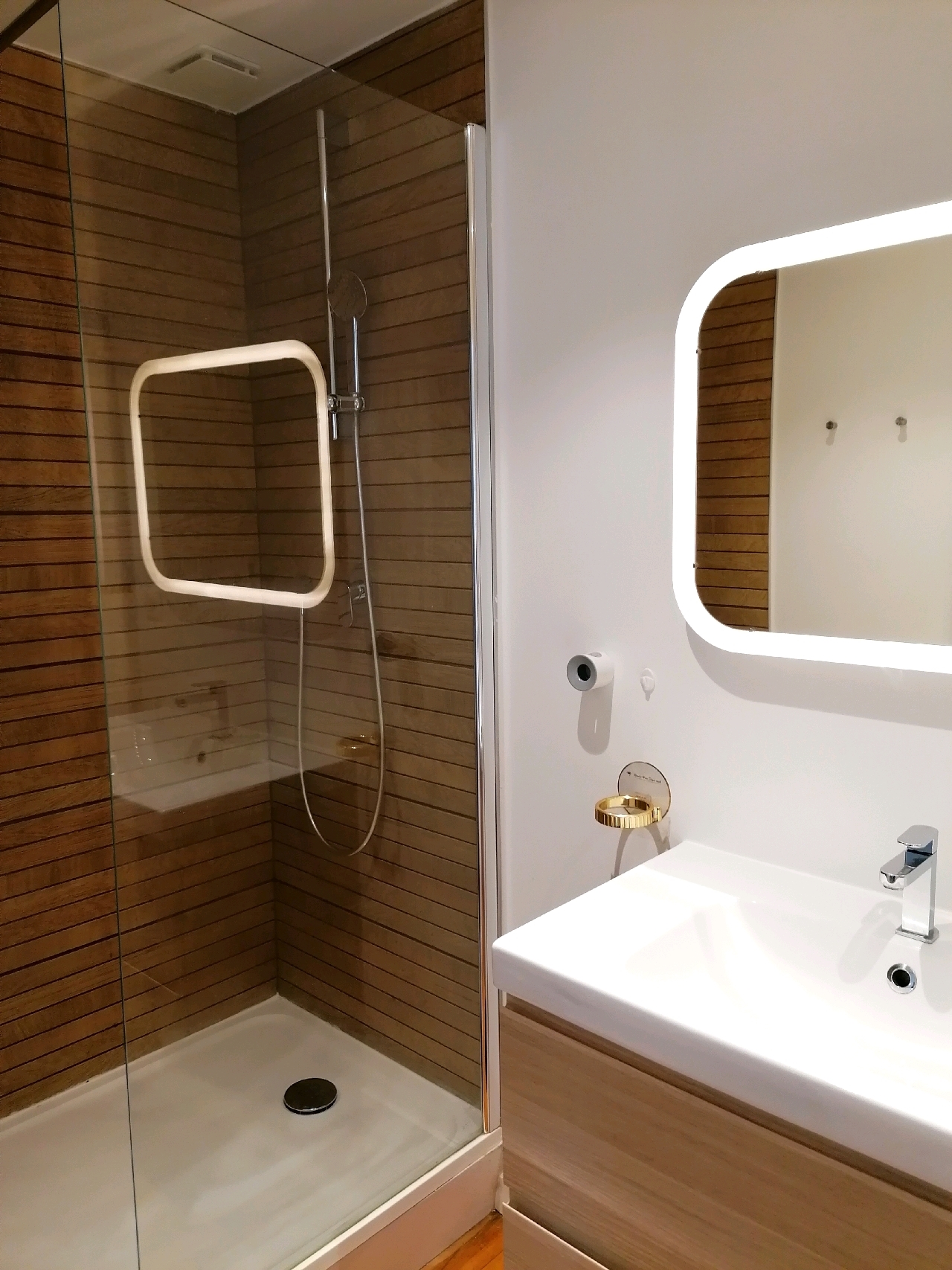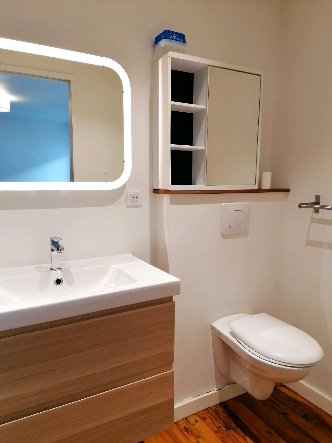 Il est composé d’une pièce principale avec placard et parquet d’origine avec son coin cuisine tout équipée (four, four micro onde, frigo top, machine à laver, aspirateur…) ouvrant sur une terrasse privative de 9 m² et d’une salle d’eau avec douche à l’italienne et WC.