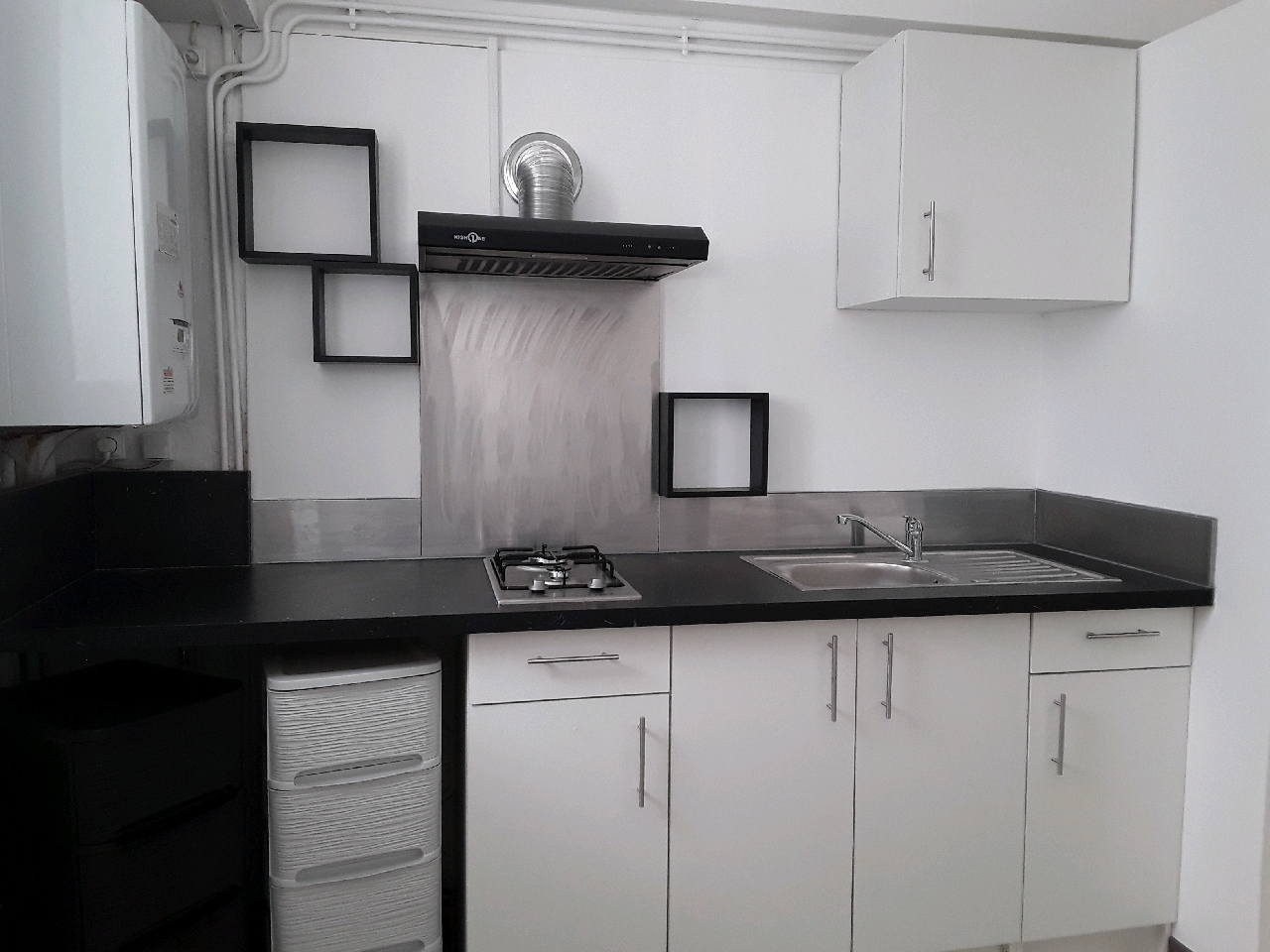 Bel espace de vie avec coin cuisine aménagé et équipé en partie séparé de la pièce principale, une chambre de 11m2, salle de bain avec WC